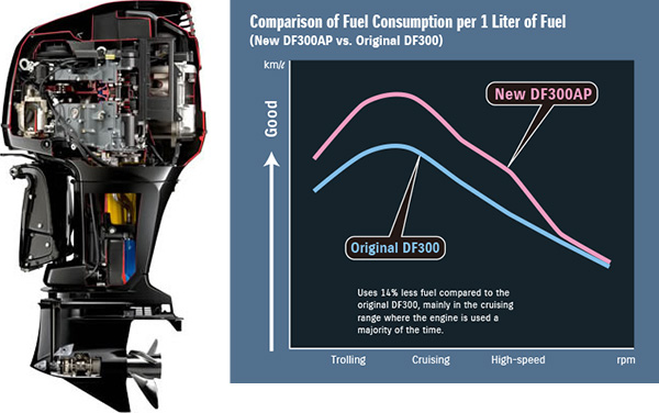 Інноваційна система контролю спалювання збіднених паливних сумішей Suzuki була вперше впроваджена на моделях DF90A/80A/70A й отримала численні схвальні відгуки від власників човнів та в ЗМІ. Вона прогнозує потреби в пальному й забезпечує постачання оптимальних збіднених паливноповітряних сумішей залежно від умов експлуатації мотора. Цю систему створено для покращення характеристик паливної економічності в усьому діапазоні обертів: від низьких до крейсерських швидкостей. А в поєднанні з системою прецизійного керування Suzuki, що передбачає електронне керування дроселем і перемиканням передач, ця система дозволяє водієві здійснювати точне керування обертами мотора для покращення економії палива в ширшому робочому діапазоні. Ця комбінація також забезпечує плавне передавання потужності в усьому діапазоні обертів. Результати внутрішніх випробувань показують, що під час руху на крейсерських швидкостях модель DF300AP характеризується на 14% більшою економією палива порівняно з оригінальним підвісним мотором DF300 без системи контролю спалювання збіднених паливних сумішей, не поступаючись останньому й щодо потужності.