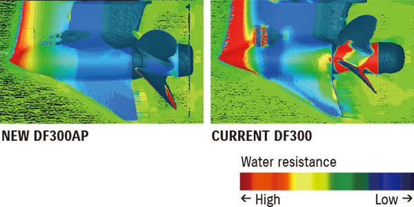 Фактичні розміри редуктора як такого більші, ніж у попередньої моделі, для забезпечення підвищеної зносостійкості й захисту механічних компонентів, але він має більш обтічну, гідродинамічну форму, яка дозволяє просуватися крізь воду значно ефективніше завдяки зменшенню опору води. Ділянки з найвищим опором позначені на ілюстраціях червоним кольором. Результаті порівняння демонструють, що ця нова конструкція дозволяє нижній частині мотора вільно рухатись, прорізаючи товщу води й практично не зустрічаючи опору.