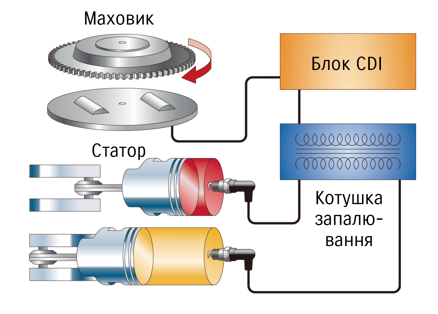 Блок CDI використовується разом з котушкою запалювання та працює як пристрій для захисту від перевищення допустимого числа обертів. Цей блок також забезпечує стабільну роботу мотора на холостому ходу.