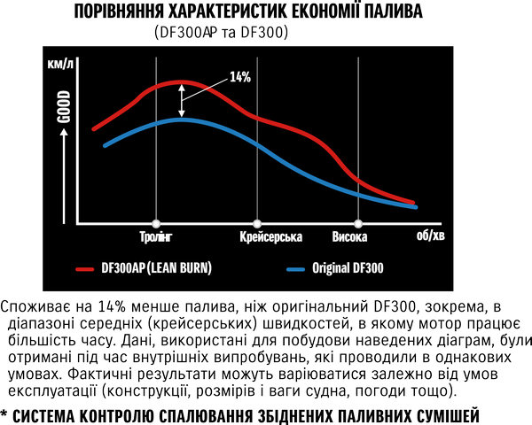 * Дані, що використовуються в графіках, були отримані в ході внутрішніх випробувань Suzuki в однакових умовах. Результати будуть залежати від умов експлуатації (конструкція човна, розмір, вага, погода тощо).