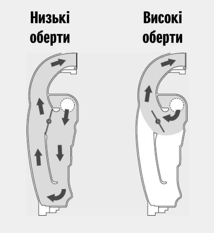 Система забезпечує надходження в двигун належного об`єму повітря через короткий та довгий патрубки під час роботи на низькій та високій швидкостях.