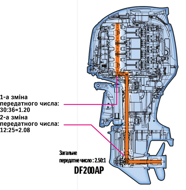 Блок двигуна розміщено ближче до передньої частини, таким чином центр ваги підвісного мотора змістився вперед.