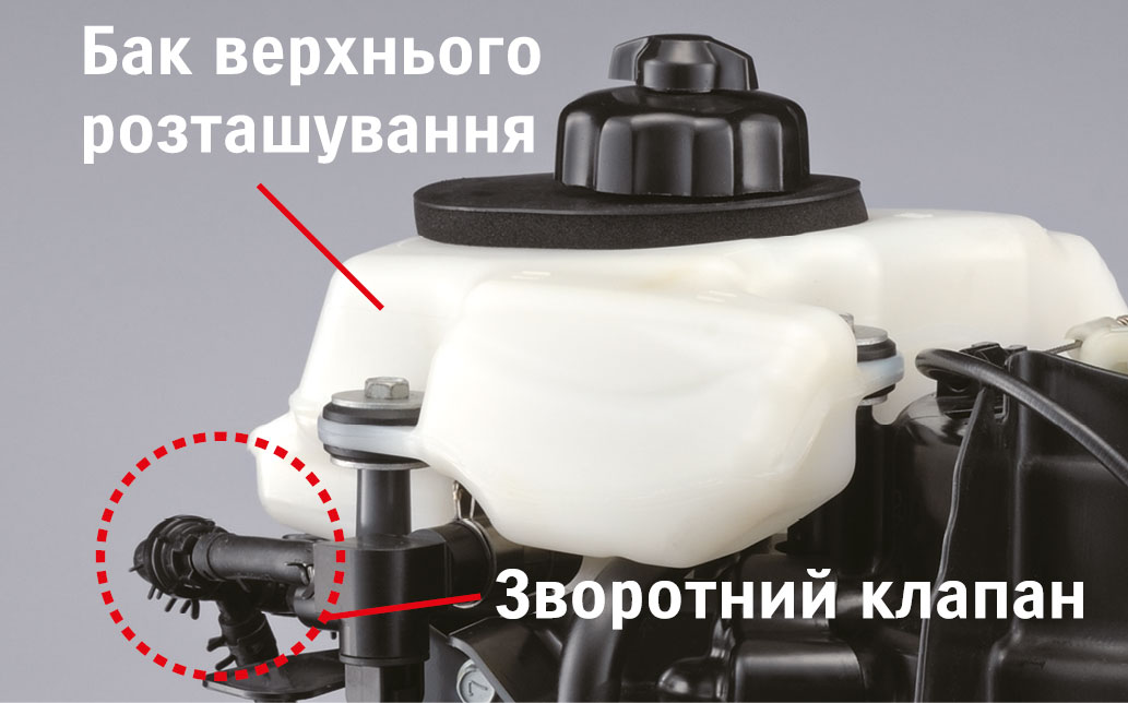 Вбудований паливний бак верхнього розташування зі зворотним клапаном забезпечує подачу палива за рахунок сили тяжіння.